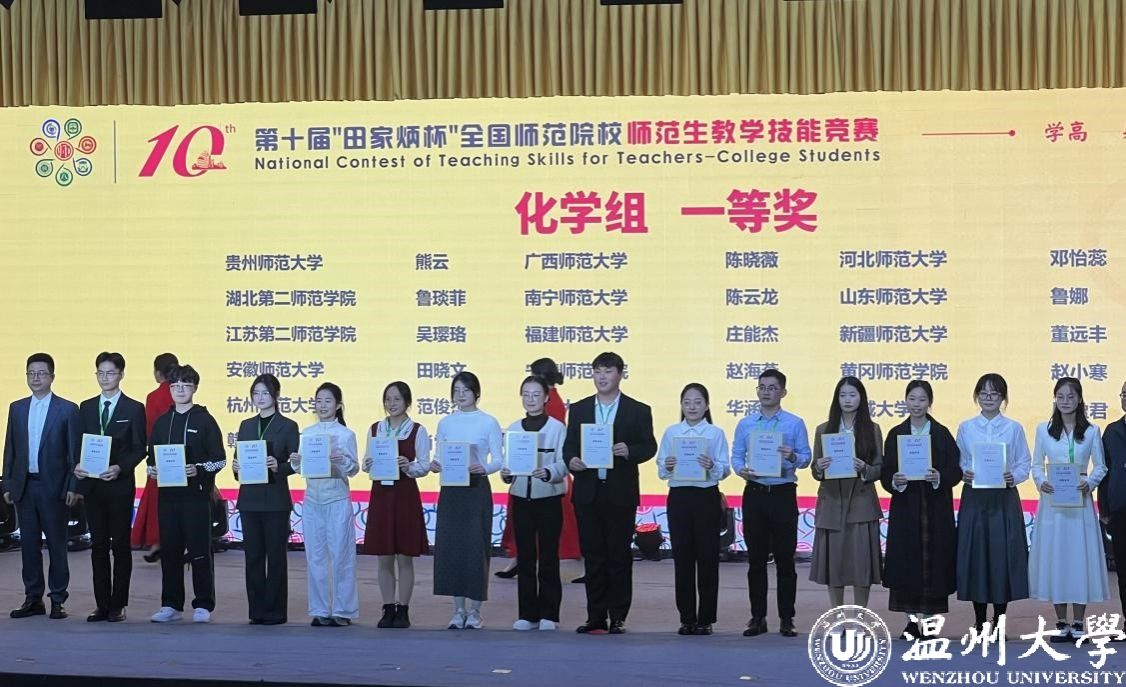 11月30日-12月1日,第十届“田家炳杯”全国师范院校师范生教学技能竞赛决赛在浙江师范大学举行。本次竞赛吸引了来自全国250所院校的1831名选手参加,参赛院校数与选手数均创历史之最,决赛最终角逐产生一等奖176 名,二等奖333名。温大参赛选手斩获2个一等奖、3个二等奖,4个三等奖,1个优胜奖,获奖率100%,获一等奖数量和获奖总数排名均列全国第20位。