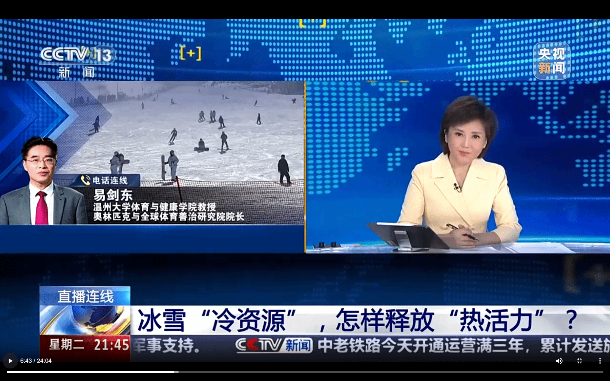 12月3日,新滑雪季扑面而来,北方多家滑雪场陆续开板营业,国际冰雪赛事也相继举行,我校易剑东教授受邀央视新闻1+1专栏直播连线,就冰雪运动发展等相关问题提出专业建议和对策。