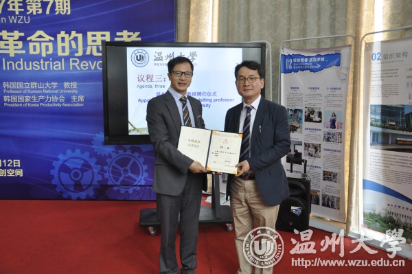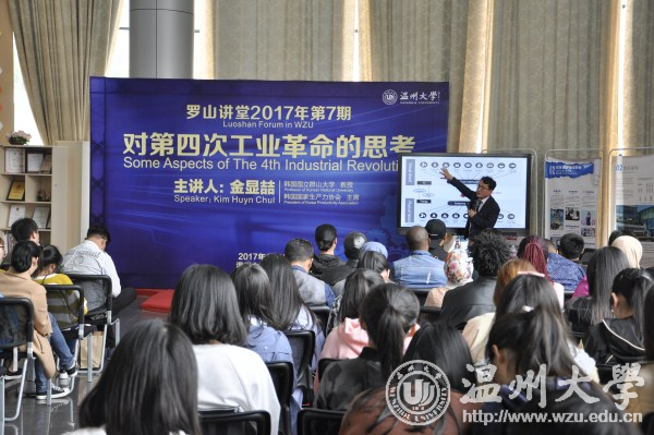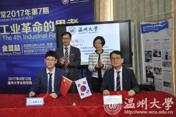 4月12日,韩国国家生产力协会主席、韩国国立群山大学金显喆教授做客罗山讲堂,给师生带来一场名为“关于第四次工业革命的思考”的主题演讲。副校长方益权,有关单位负责人,创业人才培养学院全体工作人员,企业家代表、留学生代表、创业学生代表共计一百余人聆听演讲。 创业人才培养学院负责人与金显喆共同签署中韩联合培养创业博士协议;方益权为金显喆颁发聘任证书。