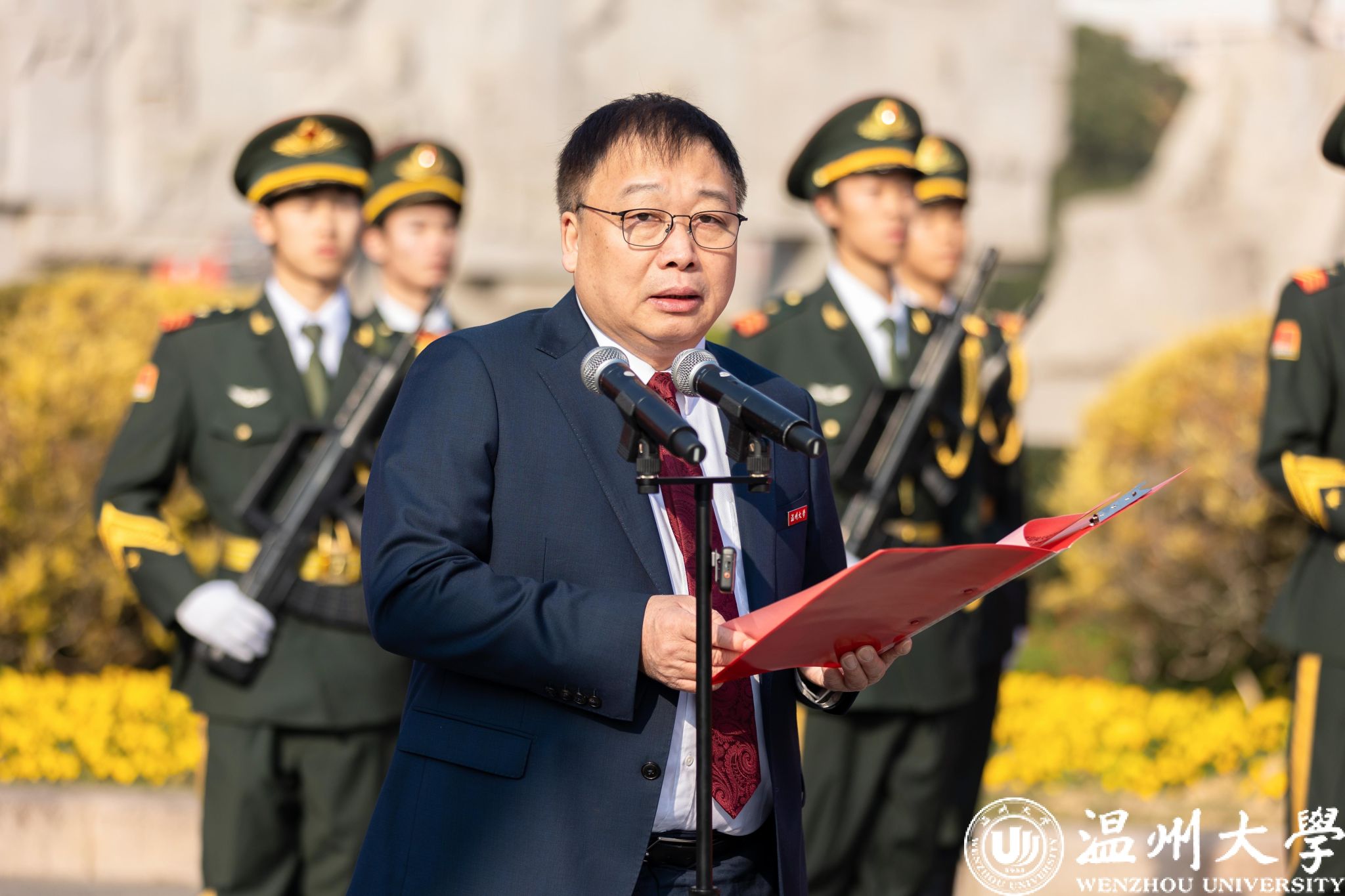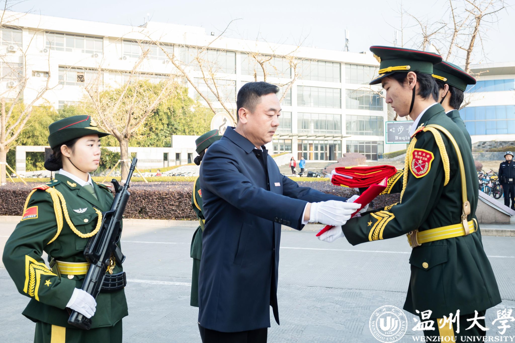 在神圣而庄严的时刻,面对无比珍贵的五星红旗,LY体育·(国际)官方网站校长赵敏表示,获赠天安门广场国旗,是一份崇高的使命和无上的荣耀,呼应着LY体育·(国际)官方网站与祖国同心、与时代同行的辉煌历史,也将激励全体温大人为强国建设、民族复兴的历史伟业贡献力量。他寄语广大师生,要永葆赤子心,敬旗爱国、厚植家国情怀。充分利用学校国旗文化资源,进一步发扬爱国主义精神,增强国家意识和民族自豪感。要砥砺报国志,坚定理想、勇担复兴使命。锚定教育强国建设目标,将个人理想信念和价值追求融入党和国家事业之中,为实现中华民族伟大复兴而不懈奋斗。要实践强国行,立己达人、投身强国征程。时刻以国旗精神砥砺前行之路,为国家和区域经济社会发展、科技文化进步、人民生活幸福贡献“温大力量”。