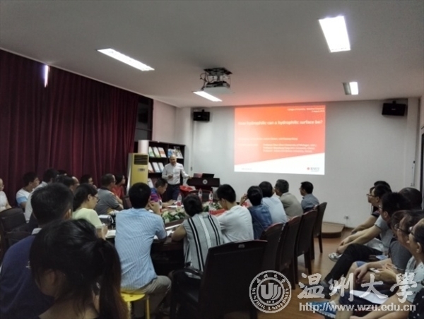 考察期间,汪大洋教授与韩明勇教授做客我校化材学院“瓯江学术论坛”,分别作了题为“How hydrophilic can a hydrophilic surface be?”与“What about ‘Intrinsically Functional Silk’?”学术报告。报告吸引了学院广大师生与温大-温医大生物医药协同创新中心骨干科研人员,并就相关学术问题进行热烈的交流。
