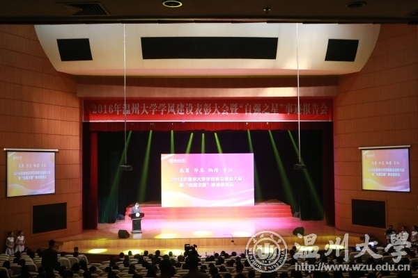 4月27日下午,我校2016年学风建设表彰大会暨“自强之星”事迹报告会在大学生活动中心育英大礼堂举行。校领导李校堃、林娟娟、牟德刚、赵敏、吴金法、陈安金、方益权、潘玉驹,校友陈国同及其夫人刘秋霞,浙江嘉华房地产有限公司总经理陈耀兴,阿联酋温州同乡会会长林时永、执行会长池云虎一行,家长代表,相关部门负责人,各学院、学区分管书记,全体辅导员,相关班主任,学院、学区学生代表参加表彰大会。