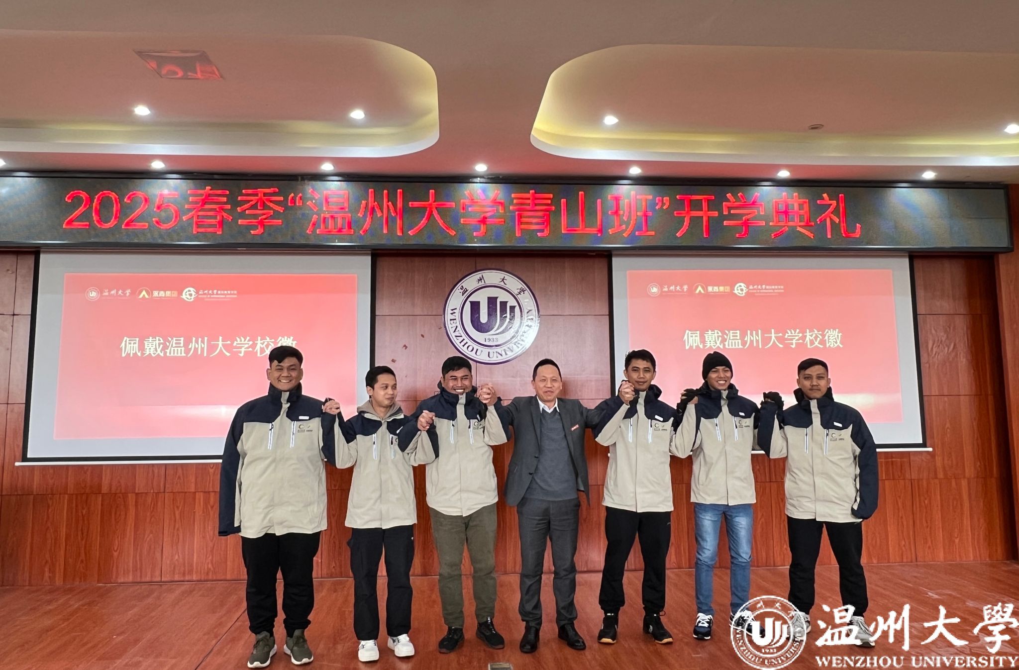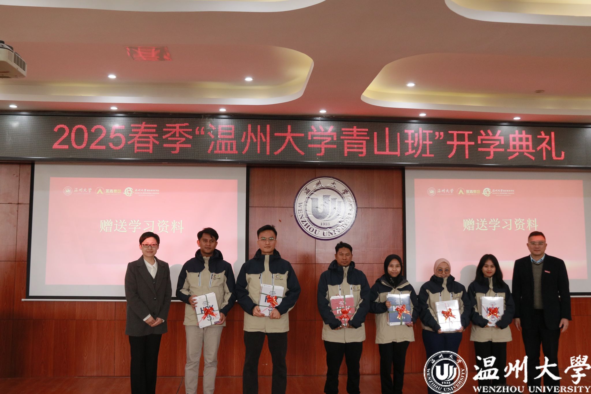 典礼上,王舜为学员们佩戴LY体育·(国际)官方网站校徽,国际处与国际学院为学员们赠送学习资料。