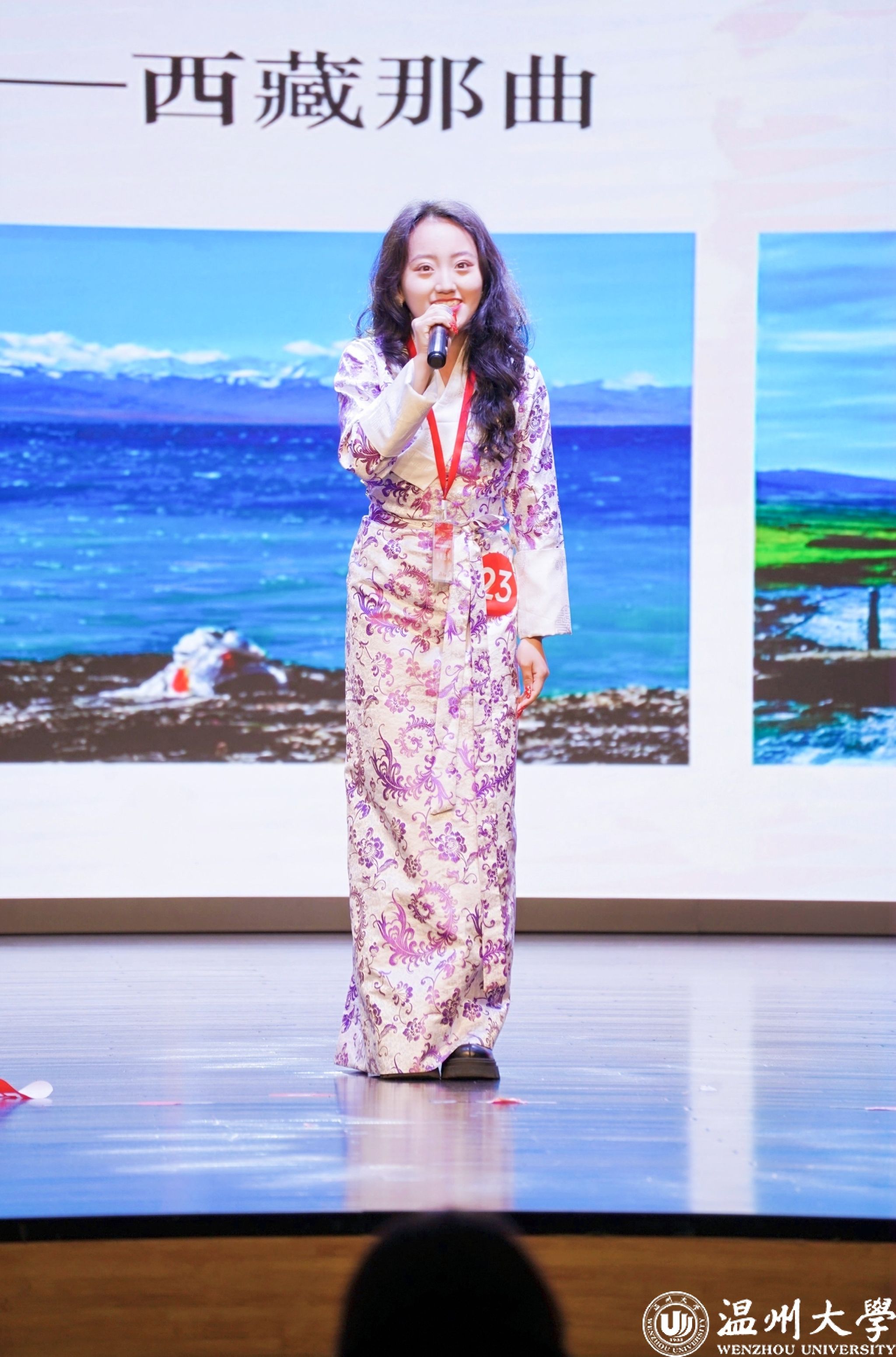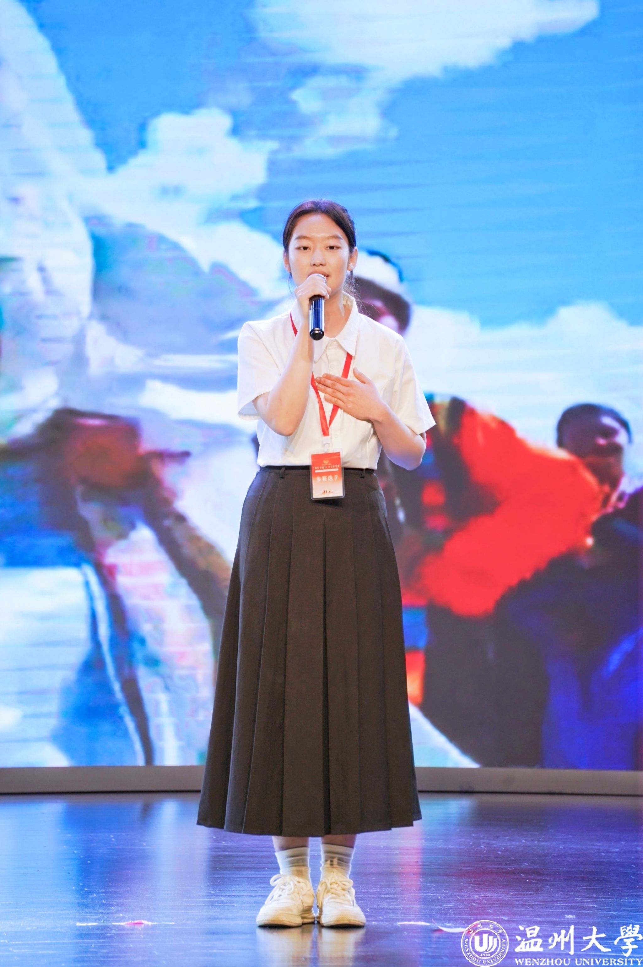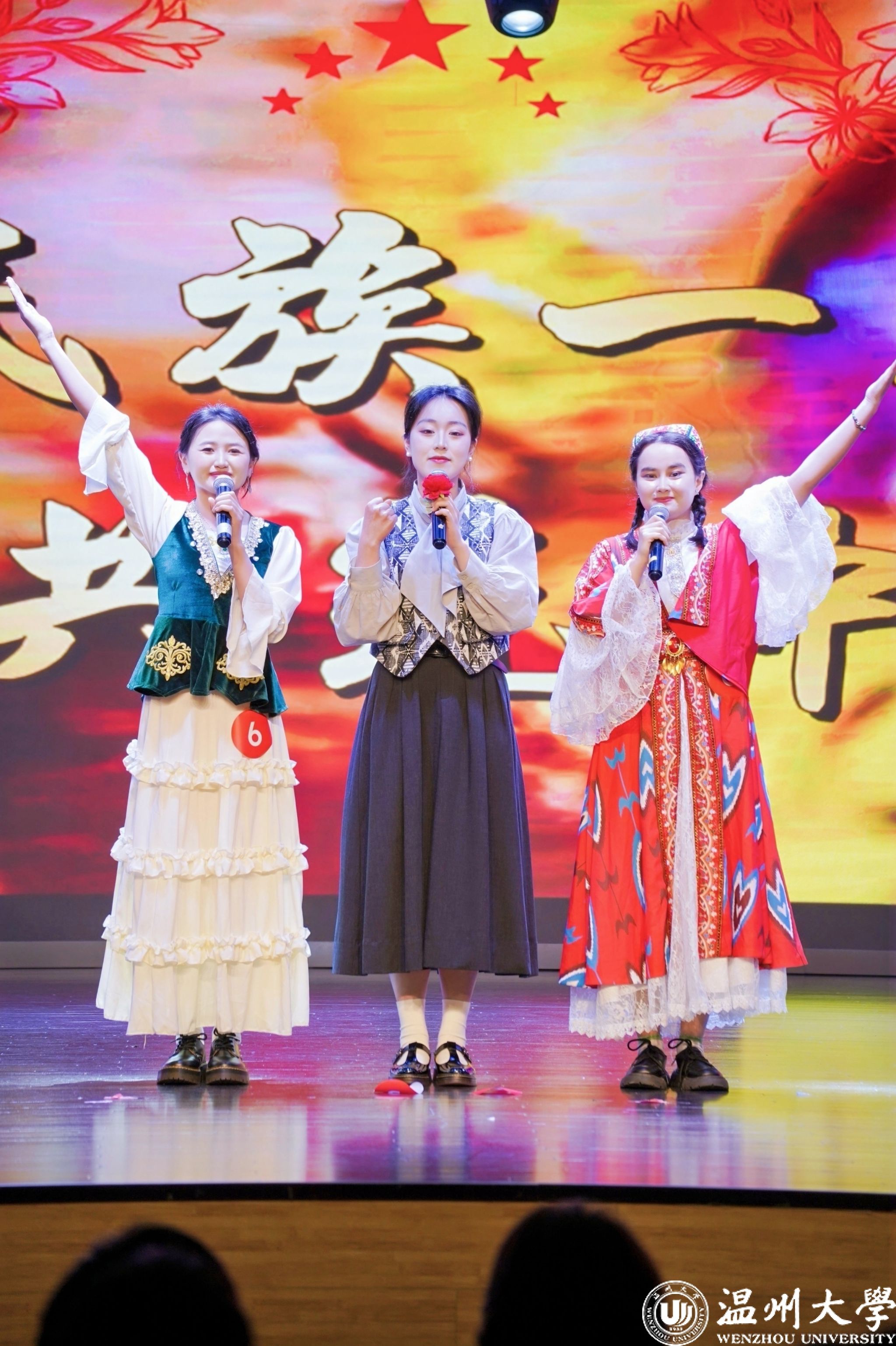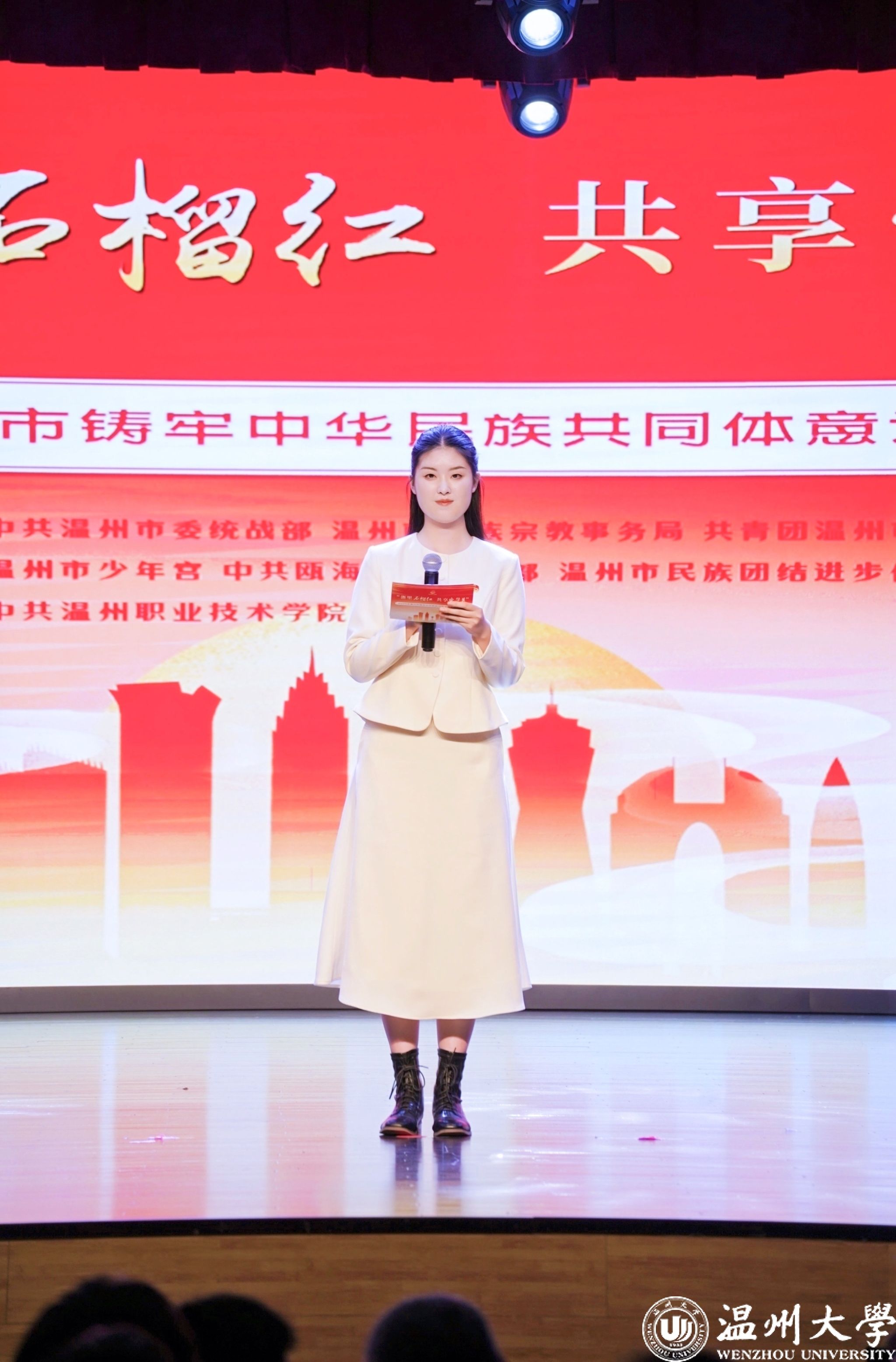 值得一提的是,曾连续两年在2023年、2024年温州市铸牢中华民族共同体意识宣讲比赛中荣获一等奖的我校优秀学子倪心倚,本次作为特邀主持人精彩亮相。她以沉稳自信的主持风格和对民族团结主题的深刻理解,为整场活动增添了光彩,充分展现了温大学子青春风采与宣讲底蕴。
