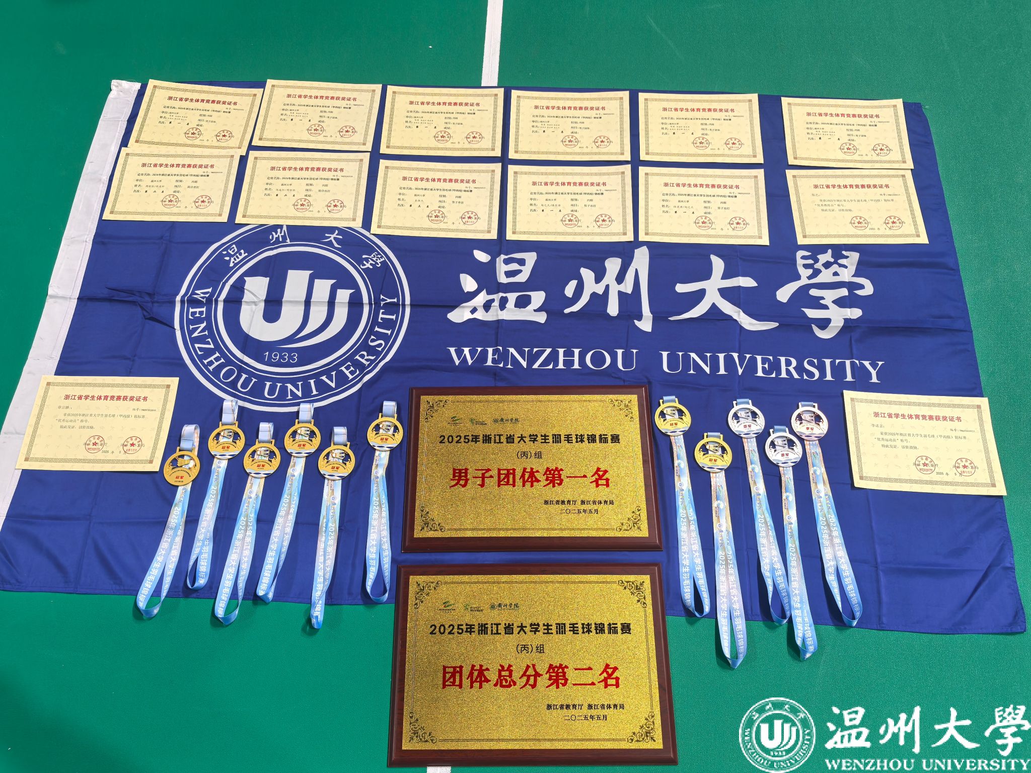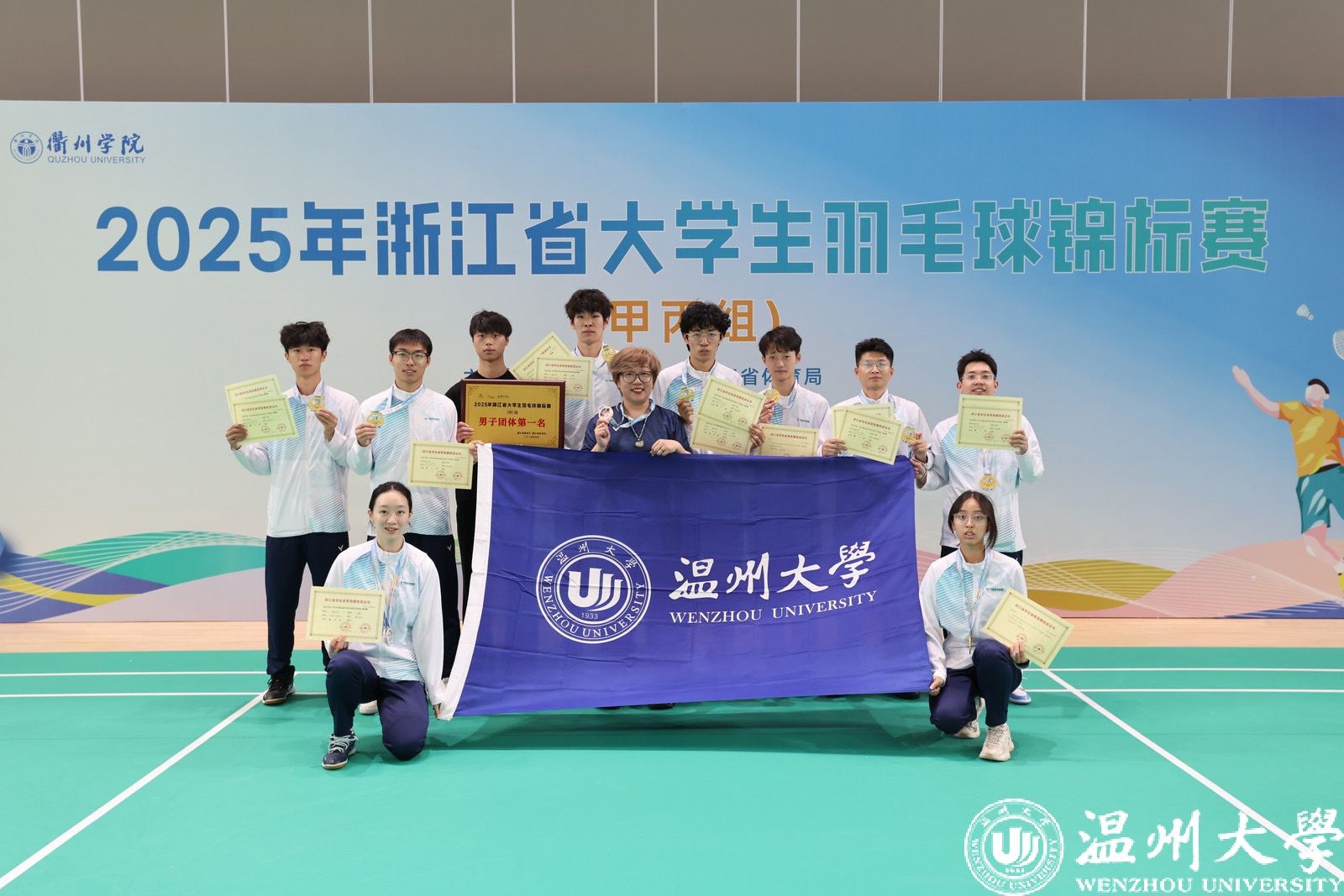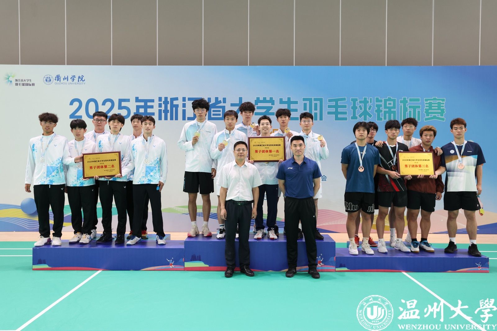 5月26日-30日,2025年浙江省大学生羽毛球锦标赛(甲丙组)在衢州江山市李宁体育园举行。在为期四天半的激烈角逐中,我校羽毛球队一举斩获丙组男子团体冠军、男双冠军、混双亚军、单打季军以及团体总分第二名,继2022年以来再次获得省级比赛冠军;2名队员获“优秀运动员”称号。