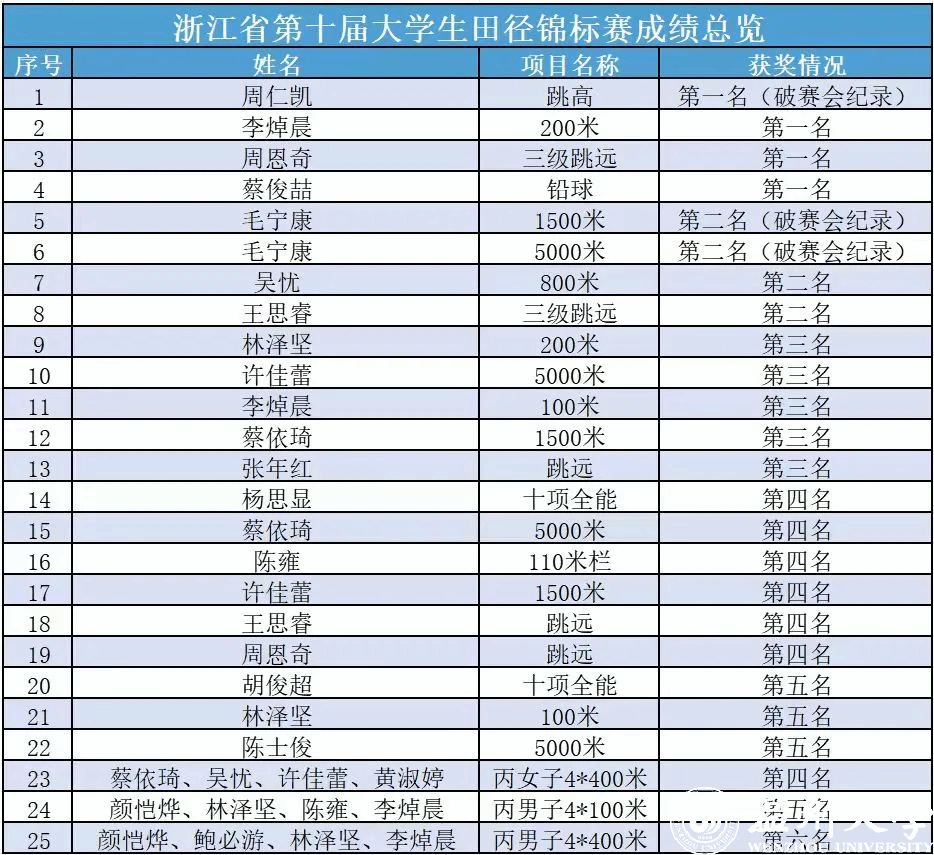 为期4天的比赛中,我校健儿顽强拼搏,获4金、4银、5铜,团体总分第三佳绩,体育与健康学院队员周仁凯在跳高项目中以2.06米的成绩打破赛会纪录,毛宁康在男子1500米、5000米比赛中分别以3:58.24和15:10.20的成绩打破赛会纪录,周仁凯、毛宁康、李焯晨、吴忧荣获“优秀运动员”荣誉称号,教师林小义、李炎荣获“优秀教练员”荣誉称号。我校20名运动员在各项目比赛中收获25个好成绩,为队伍参加本赛事来的最好成绩(详见成绩总览)。