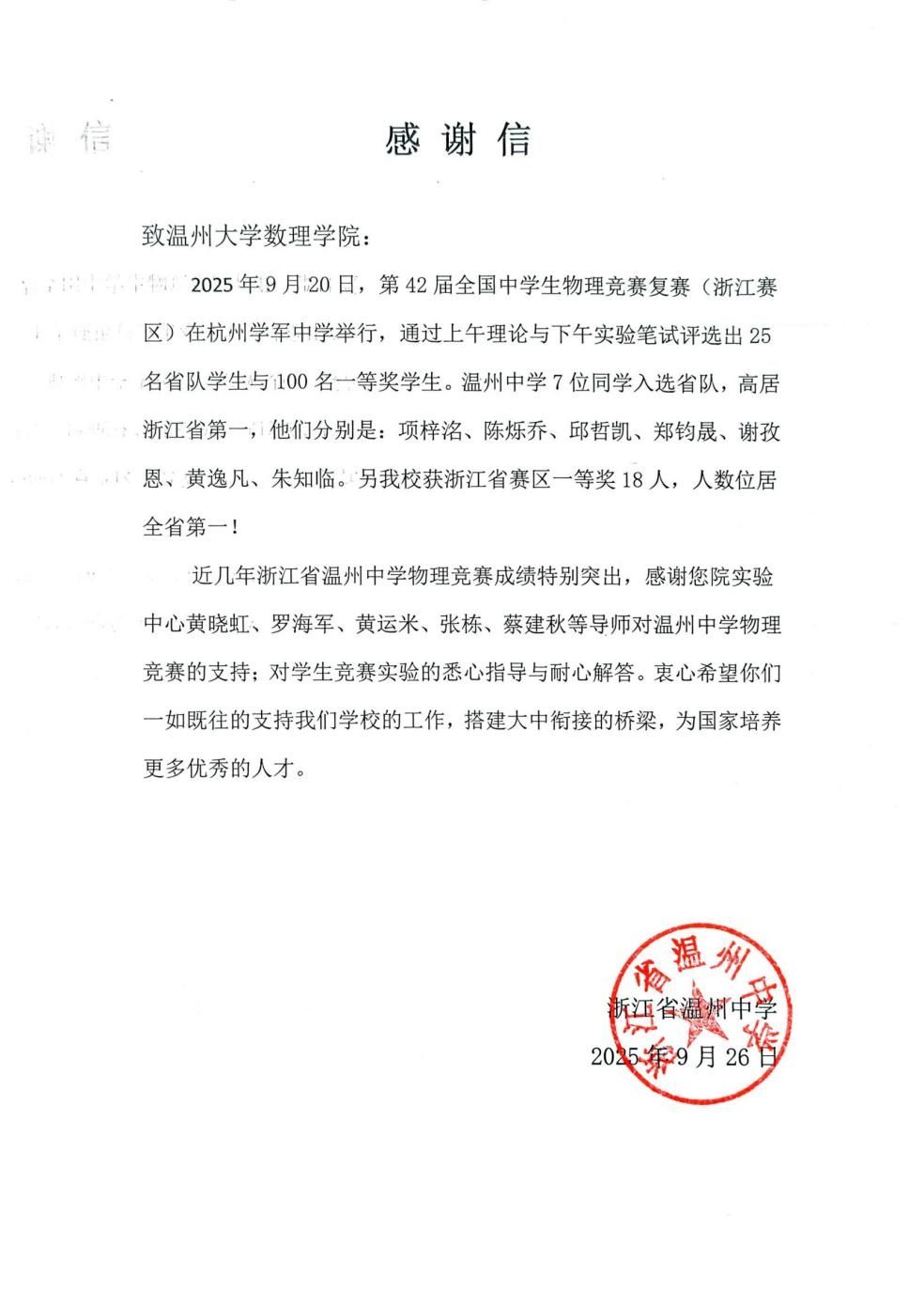 近日,LY体育·(国际)官方网站数理学院再次收到来自浙江省温州中学的感谢信,对学院长期支持物理竞赛辅导工作表示感谢。在刚刚结束的第42届全国中学生物理竞赛复赛(浙江赛区)中,温州中学7名学生入选省队、18名学生获浙江省一等奖,两项成绩均位居全省第一。