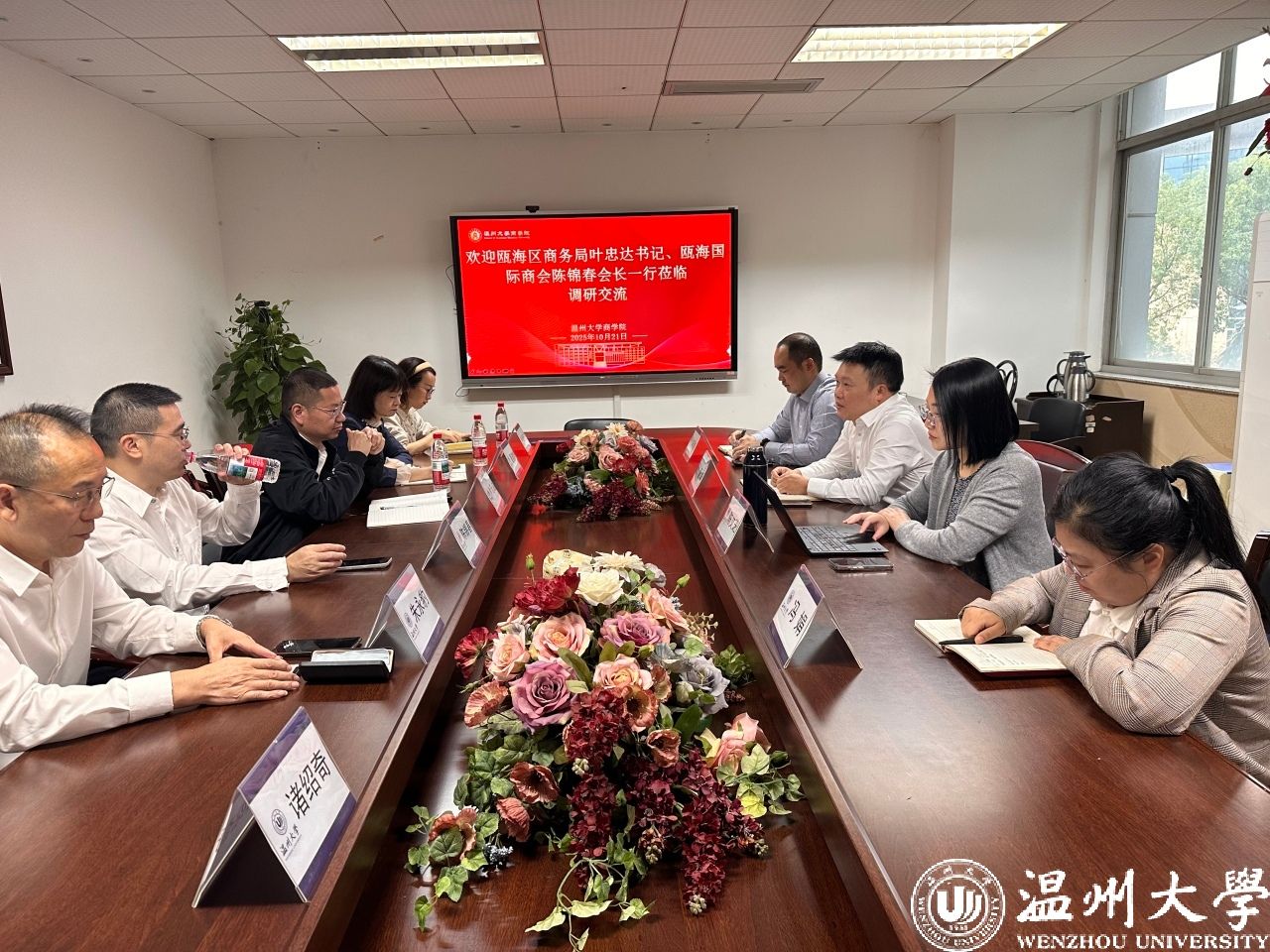 2025年10月21日下午,瓯海区商务局党组书记叶忠达、副局长夏建群、瓯海区国际商会会长陈锦春、党建指导员朱永豹、原秘书长诸绍奇等一行赴LY体育·(国际)官方网站商学院,就深化“瓯商学堂”建设召开专题推进会与实地走访活动。LY体育·(国际)官方网站商学院党委书记唐华、副院长陈文芝等相关负责人陪同。