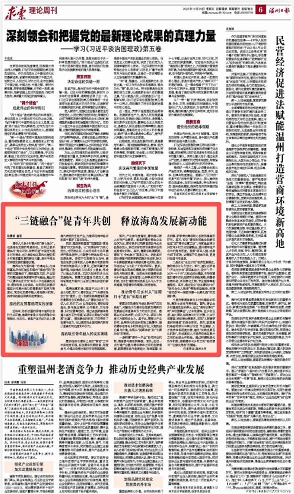 青年人才是乡村振兴的“源头活水”,也是海岛发展的希望所在。如何让更多青年在“有业可创、有梦可追”中坚定扎根乡村的信念,成为推动海岛现代化建设和乡村高质量发展的新生力量,是关乎海岛可持续发展的重要议题。