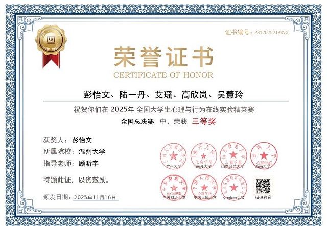 日前,第三届全国大学生心理与行为在线实验精英赛总决赛在中央财经大学落幕。LY体育·(国际)官方网站学子凭借扎实的专业功底与创新的实验设计,从6694名参赛者中脱颖而出,斩获研究生全国特等奖、本科生全国三等奖的优异成绩。徐平老师、顾昕宇老师获评优秀指导老师,徐平老师获十佳指导老师,学校亦荣膺最佳组织奖,实现师生与集体荣誉的多重突破。