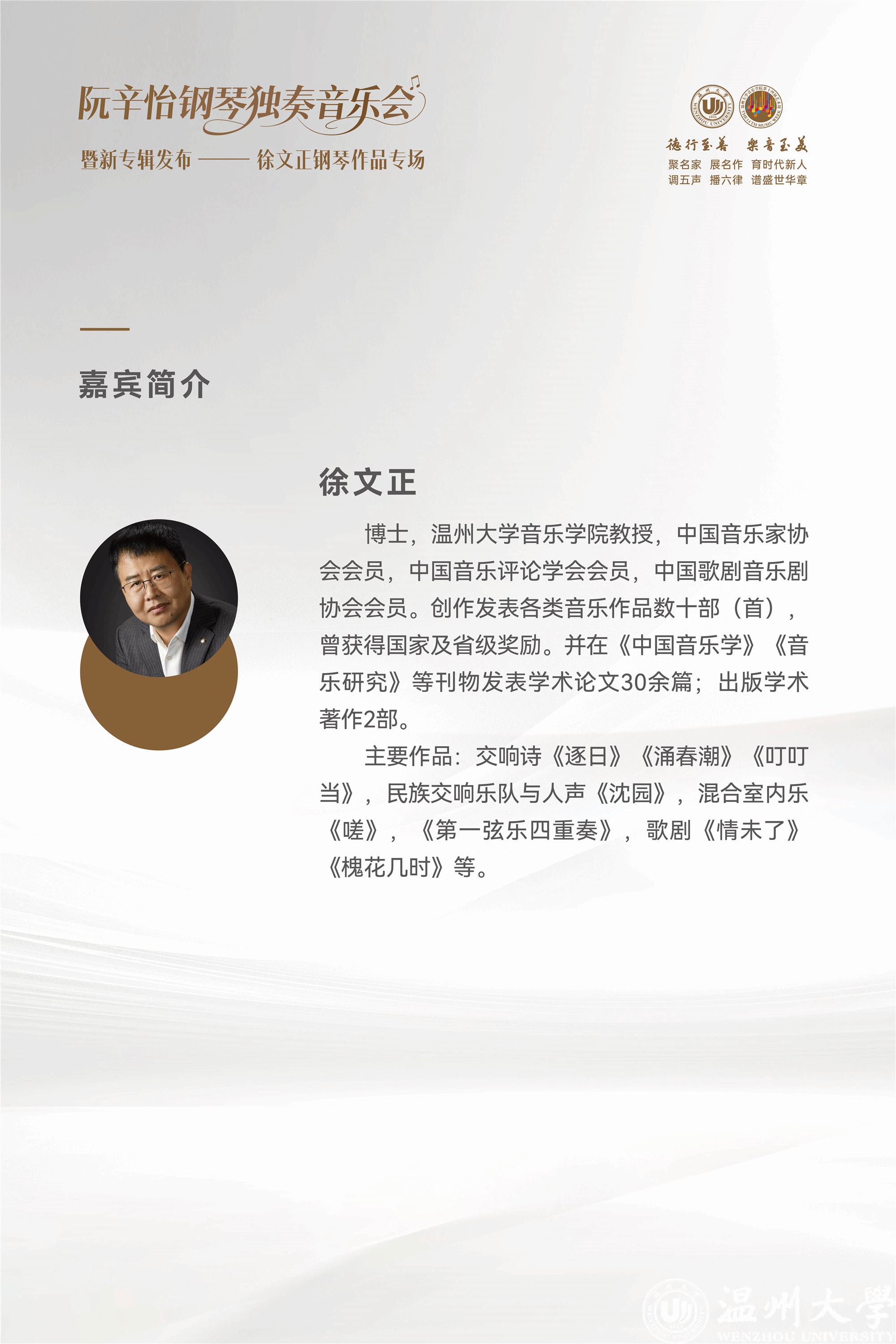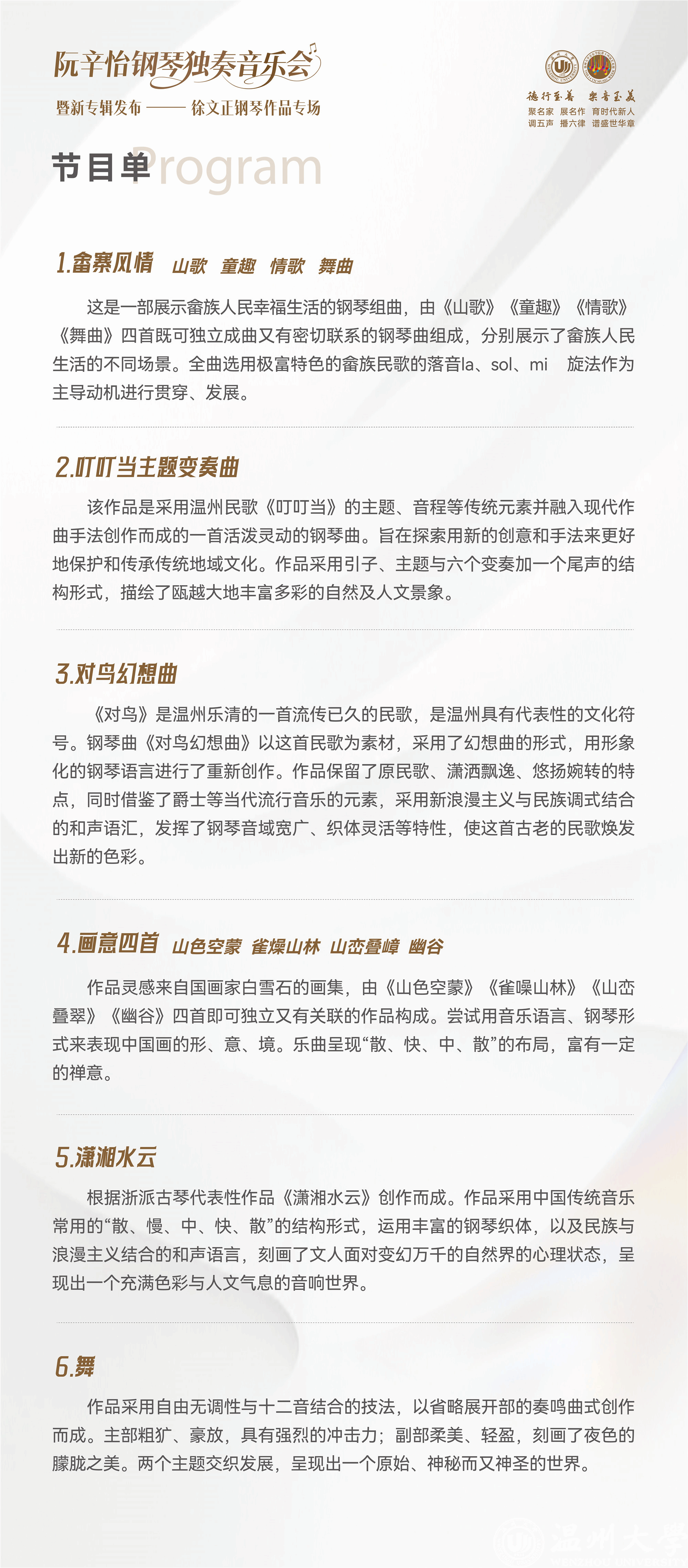 据悉,本场音乐会也是《舞——阮辛怡演奏徐文正钢琴作品专辑》的发布会。专辑收录了除《对鸟幻想曲》外的上述作品,以及国内首部全面反映畲族风情的钢琴组曲《畲寨风情》等多部具有开创性的作品。此次活动也是LY体育·(国际)官方网站音乐学院“教研创表”一体化人才培养模式的一次集中展示,标志着温州地域文化在高等艺术教育领域结出新成果。