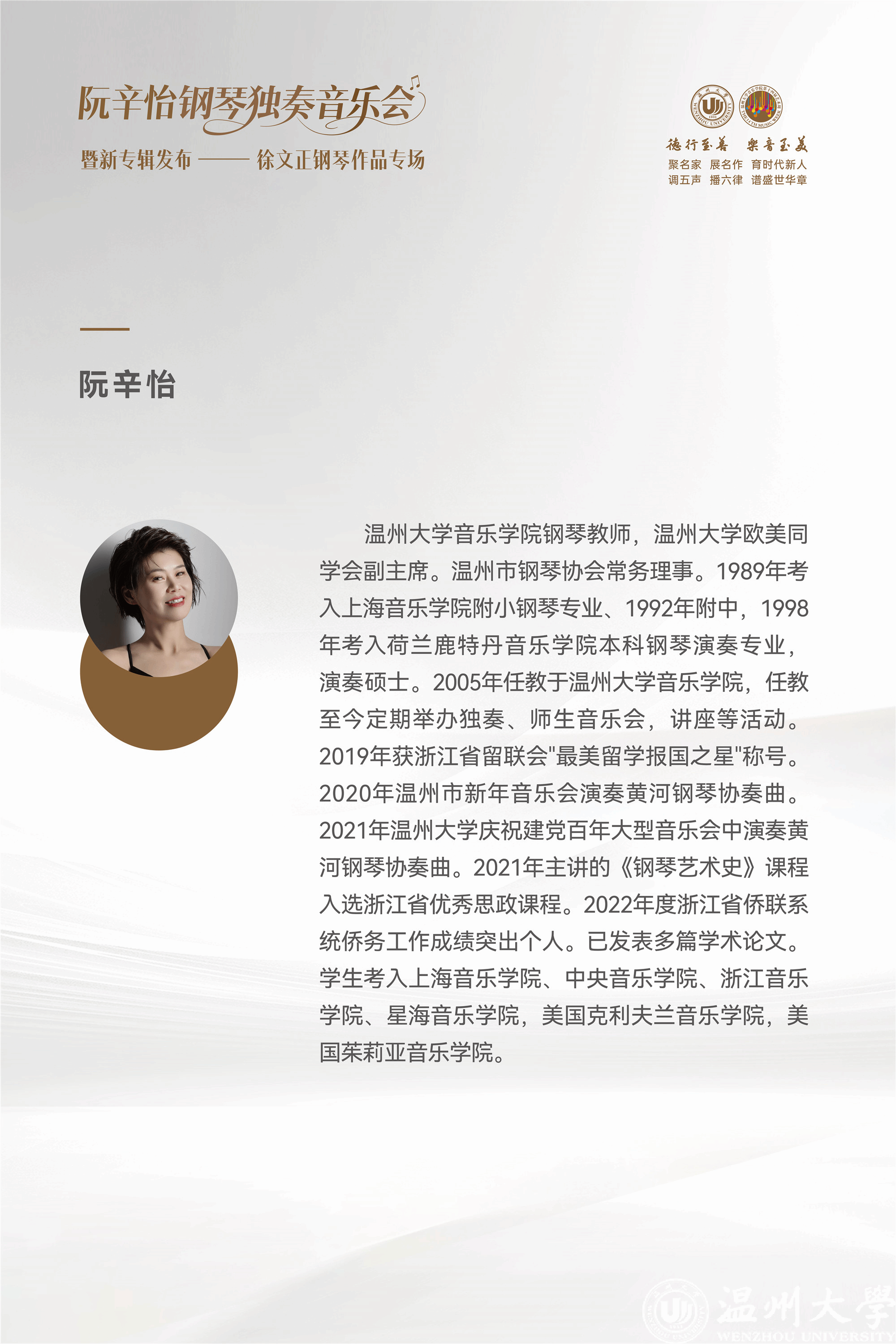 在阮辛怡看来,这一切都是一段漫长的“培育”过程。作曲家给予作品“种子”,演奏家给予作品“营养”,“直到它们在听众面前弹起,才是作品真正的‘诞生’。”对于这场期待已久的首演,她表示,这不仅仅是一场作品汇报,更是一封以钢琴为笔、以瓯越文化为墨,写给世界的“邀请函”。“我希望能通过钢琴这一世界性乐器,让温州文化走向更广阔的舞台,让更多人领略瓯越大地的魅力。”