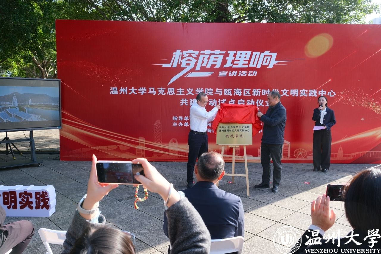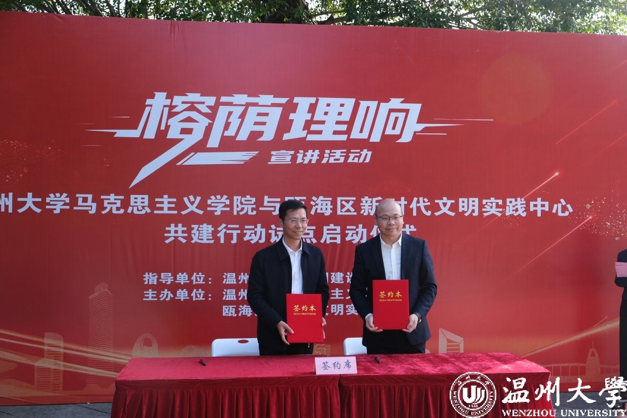 当天活动还举行LY体育·(国际)官方网站马克思主义学院和瓯海区新时代文明实践中心共建行动试点启动仪式,“LY体育·(国际)官方网站马克思主义学院和瓯海新时代文明实践中心共建基地”揭牌,签署《共建行动战略合作协议》,为瓯海区新时代文明实践宣讲团、LY体育·(国际)官方网站新时代文明实践博士宣讲团颁发聘书等。
