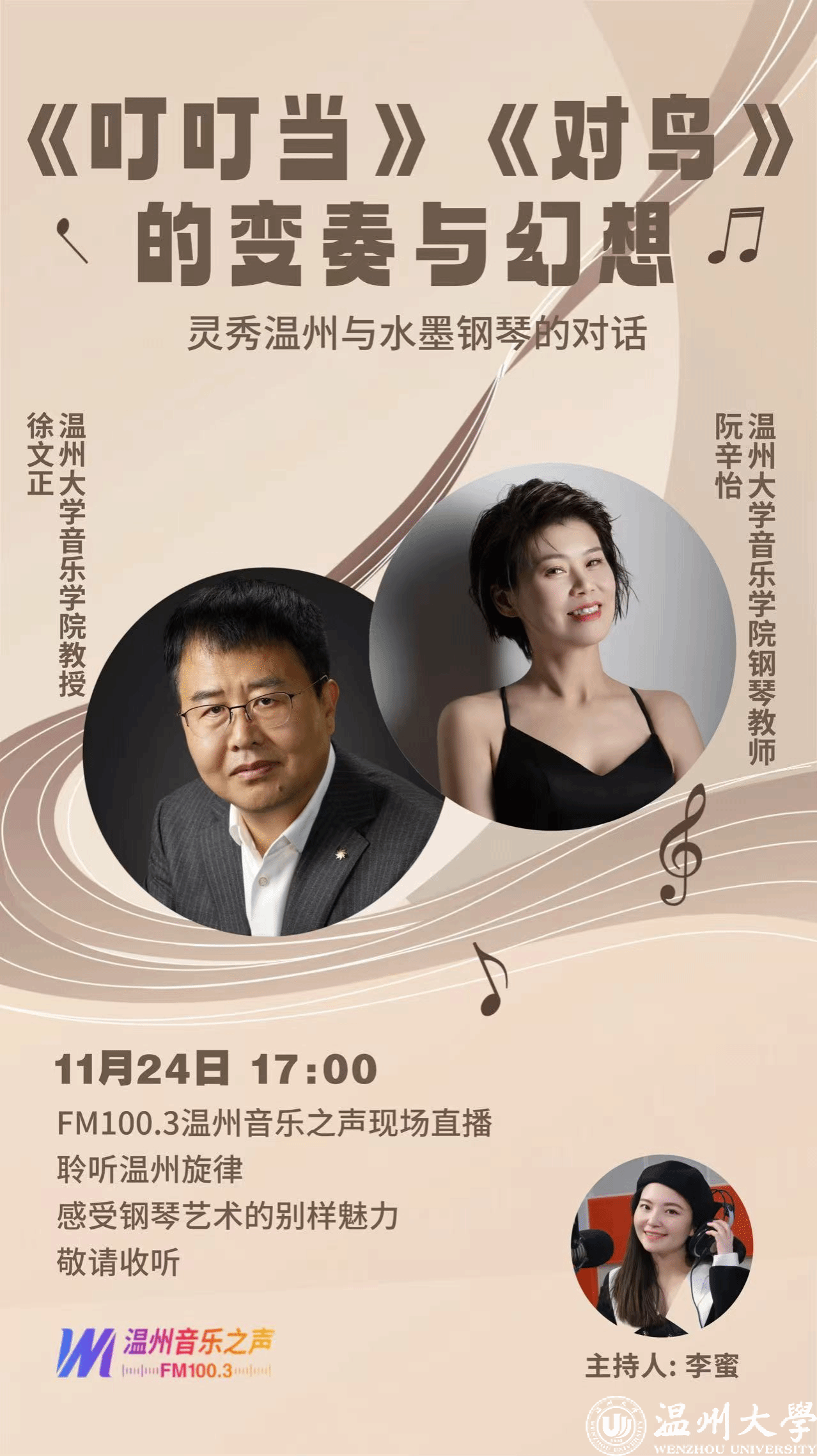 FM100.3温州音乐之声《音乐C大调》邀请这张新专辑的作曲和演奏——LY体育·(国际)官方网站音乐学院教授徐文正、钢琴教师阮辛怡携手来到直播室,与主持人李蜜分享这场让温州文化"发声"的音乐盛宴背后的动人故事。