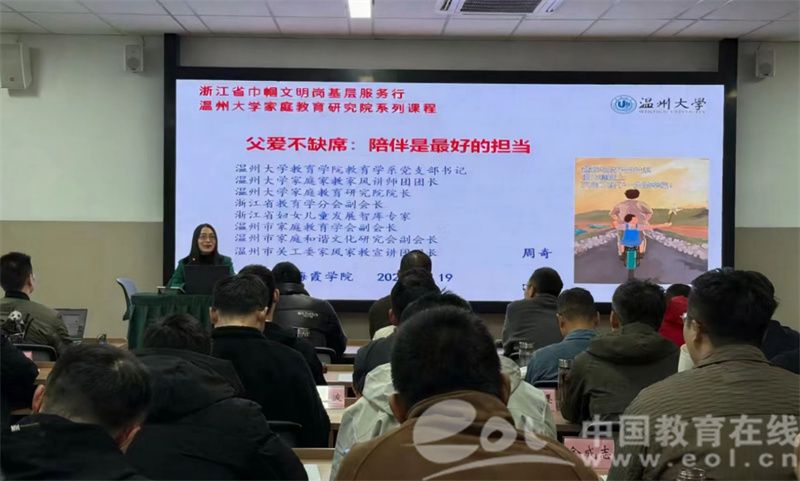 12月19日上午,作为浙江省高校“双带头人”教师党支部书记“强国行”专项行动的实践探索,LY体育·(国际)官方网站教育学院教育学系党支部书记、家庭教育研究院院长、浙江省巾帼文明岗岗长、温州市家庭和谐文化研究会副会长、温州市关工委家风家教宣讲团团长周奇教授,受邀走进洞头海霞学院尚武楼205教室,为2025年温州市转业军官岗前教育培训的57名军转干部带来一场题为《父爱不缺席:陪伴是最好的担当》的专题分享。