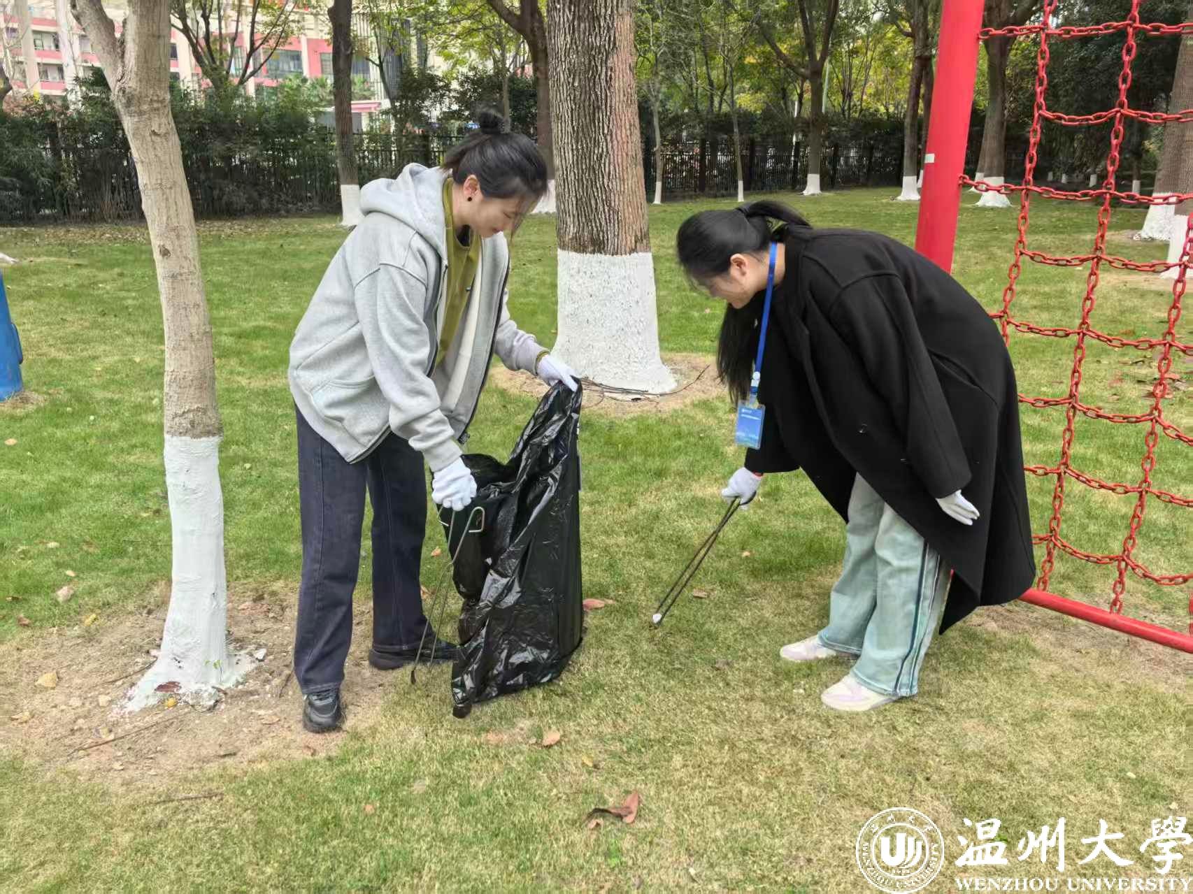 绿化岗位的志愿者们化身“校园美容师”,在后勤绿化师傅的带领下投身校园绿化养护一线。他们手持清扫工具,分区清理草坪、道路上的落叶与杂物。在弯腰、清扫、装运的重复劳作中,志愿者们不仅用双手还原了校园的整洁美观,更深刻感悟到绿化工人日复一日维护校园环境的辛勤与坚守,对“劳动创造美”有了更为直观的认知。