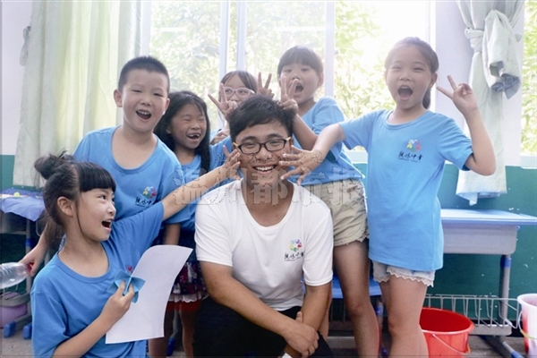 “快乐之家”的孩子们和大学生志愿者在一起。
