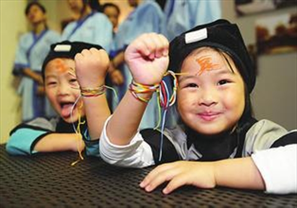 从端午习俗的内容与功能上看,五月仲夏时节,疫情高发、毒虫滋生,人们借助神奇能量保佑自己的后代健康而茁壮的成长。在乐清,有用五色线连成一根长线,缠绕在小孩手腕上,一直到乞巧节才能解开。长命线不仅可以辟邪,也可以保佑孩子健康长寿,现在更多是一种装饰品。类似起求吉辟邪作用的还有平阳山区妇女给小孩挂在身上的“香袋”、端午给孩子穿虎头鞋、戴虎头帽的习俗,借助虎的威猛形象,驱赶恶煞。苍南做“草头汤”供小孩沐浴,可不染痢疾。