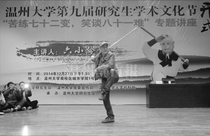 讲座结束后,六小龄童舞起了手中的“金箍棒”,将场上的气氛推向了高潮。昨晚,六小龄童还到温州医科大学与大学生交流。