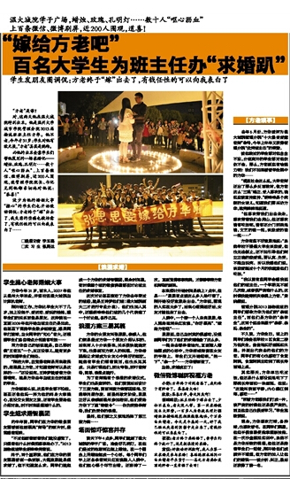 而他的出名全靠学生们帮他策划的一场求婚记——蜡烛、玫瑰、孔明灯……数十人“呕心沥血”,上百条微信、微博刷屏,近200人围观,连管理学院院长、书记见到他都亲切地对他说:“恭喜!”