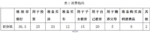 首先来看看处于中间群体的温州人对于存款使用的选择。我们把对存款的使用称之为消费趋向,中间群体作为中高收入和高学历的代表,加之他们数量上的优势,他们的消费趋向往往能够引导整个社会的潮流变化。从下图(表1)中可以看出,使用存款比例最高的是继续存银行,其次是准备买房,然后是投资、用于自己的教育。可以看出消费趋向仍然偏重于传统,说明持积累态度的人在这一群体中还很多,同时也表现出很强的分化,即对于自己和子女教育的重视、投资的高比例以及购买房子都显示出他们与传统的分化。中间群体已经初步形成了不同于传统的且相对理性、具有超前意识的现代消费观念,即具有较强的投资理财意识、极为重视教育的投资、能够接受分期付款等现代消费方式等等。