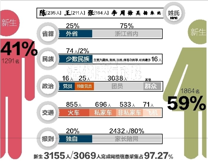 今年温大共有74名少数民族新生,约占全部新生总人数的2%,主要为藏族、苗族、白族、维吾尔族等,其中壮族最多,为16人。有2923人会在9月18日按时报到,其他学生或请假或提前到校。当天报到学生中,有1127人需要学校派人接站,接站地点多为火车温州南站和温州火车站,占需要接站学生的65%左右。