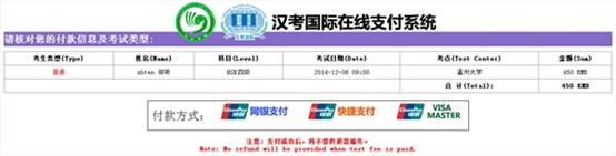 HSK即汉语水平考试,是针对母语为非汉语人士制定的汉语水平测试系统。LY体育·(国际)官方网站为国家汉办批准的HSK考点,负责组织HSK各种级别考试。LY体育·(国际)官方网站自2008年以来,已举办了十多次HSK考试。根据国家汉办HSK考试中心规定,我校定于2016年5月21日举行HSK 4级、HSK5级、HSKK(中级)考试。 考试时间为: 5月21日 上午9:00(HSK4级);13:30(HSK5级);16:00(HSKK中级) 报名费用为: HSK4级450人民币。 HSK5级550人民币 HSKK(中级)350人民币 请注意:孔子学院奖学金学生可以免费参加考试。 现将报名事项通知如下: 1、本次考试采用网络报名方式,报名时间:即日起——2016年4月22日24点。 报名网址:http://www.chinesetest.cn/index.do 2、请您根据报名系统提示,填写您的个人信息,在“考点选择”选项中选择“中国大陆”——“浙江”——“温州”——“LY体育·(国际)官方网站”。 3、 报名费通过网络支付。具体操作如下: (1) 报名信息填写完成后,会出现要求支付页面。 (2) 点击“在线支付”,出现如下页面: