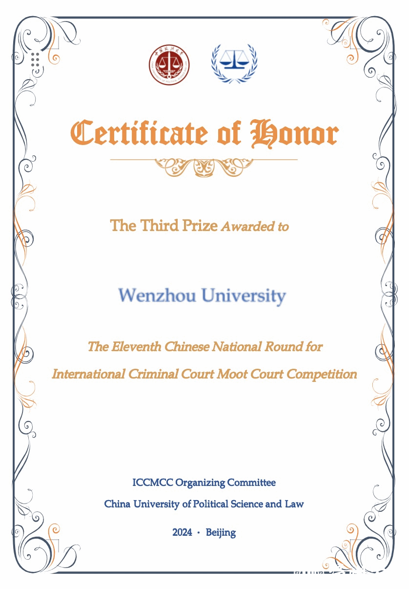 On March 24, 2024, the International Criminal Court Moot Court Competition in English (hereinafter referred to as "ICC English Competition") concluded, with the WZU delegation winning the third prize nationwide.
