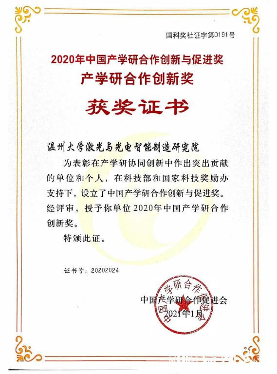 Wenzhou University Laser and Optoelectronics Intelligent Manufacturing Research Institute won Industry-university-research cooperation innovation award (institute)