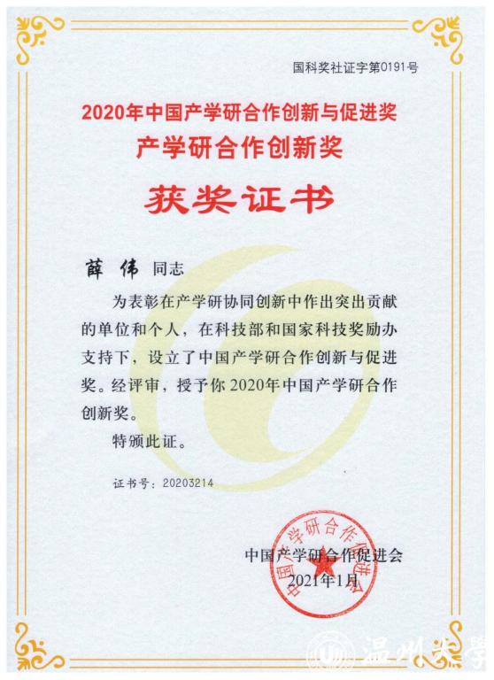 China Invention Association and China Association for the Promotion of Industry-University-Research Cooperation successively announced the 2020 Invention and Entrepreneurship & Innovation Award and 2020 China Industry-University-Research Cooperation Innovation and Promotion Award. The team led by Professor Xue Wei from Wenzhou University won the first prize of Invention and Entrepreneurship & Innovation Award (approved by Ministry of Science and Technology), Industry-university-research cooperation innovation award (individual), and Industry-university-research cooperation innovation award (institute).