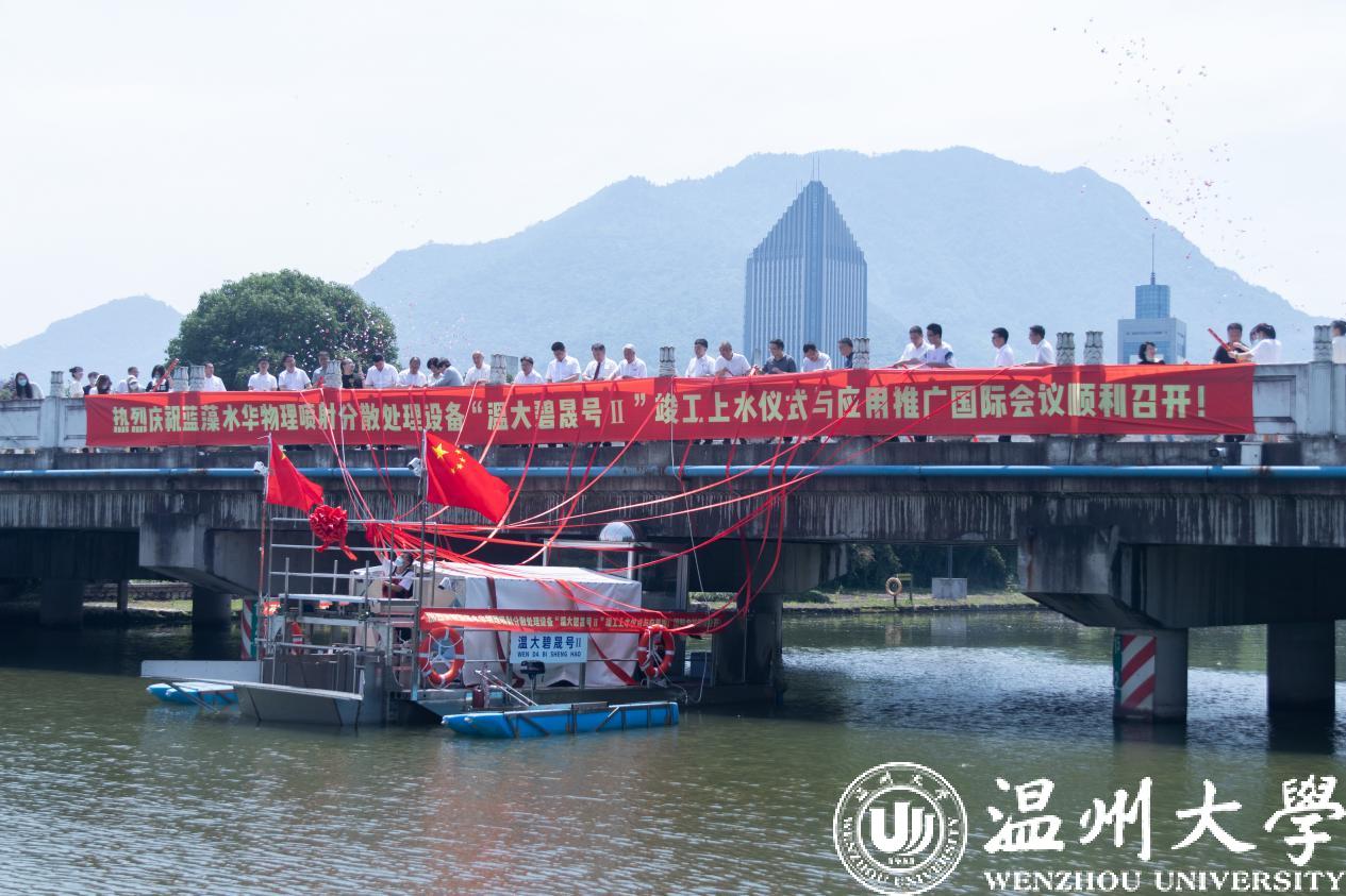 Today the second generation of physical jetting treatment device for cyanobacterial bloom independently developed by Wenzhou University of Zhejiang Province-“Bisheng II” was put into water for trial in Wenzhou. A number of academicians, experts and professors from Japan, Canada and over 10 higher education institutes in China participated in the trial ceremony online and offline. Reporters at the scene saw that the device, through breaking up the cyanobacteria population by spraying and jetting, is able to re-enter the ecological food chain and treat cyanobacterial bloom in an ecological way.