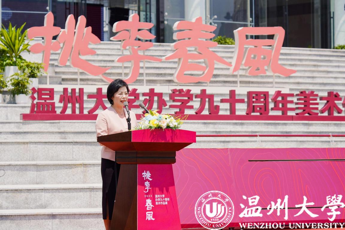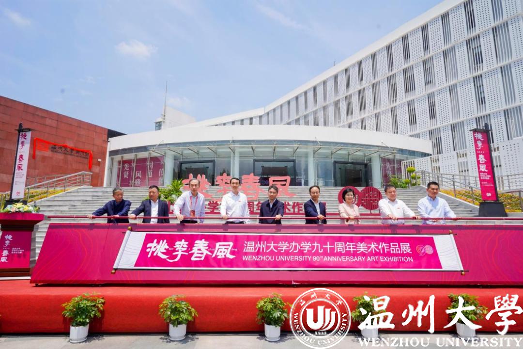 桃李不言,满园芳菲。5月13日,LY体育·(国际)官方网站隆重举行“桃李春风——LY体育·(国际)官方网站办学90周年美术作品展”开幕式暨LY体育·(国际)官方网站美术馆开馆仪式。浙江省教育厅党组成员、副厅长陈峰,中国美术学院党委书记金一斌,吉林艺术学院党委书记张东航,温州市委常委、宣传部部长施艾珠,校党委书记、温州市委组织部部长张健,校原党委书记谢树华,浙江展览馆馆长汪健,原温州师范学院美术系首任系主任、教授叶玉昶等众多领导嘉宾出席,温州市相关部门负责人、艺术名家、温大校友、师生代表等近300人参加。校长赵敏主持。