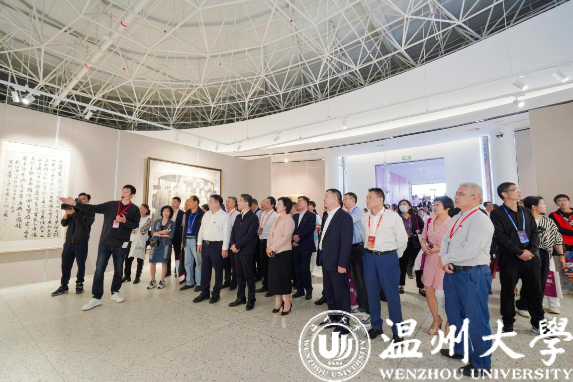 仪式结束,领导、嘉宾、校友、师生共同进入美术馆参观作品展。本次展览分为“先贤风雅”“同道传薪”两大板块,共展出了156位先贤、名家、教师和校友作品,涵盖国画、油画、版画、水彩画、综合绘画、书法、篆刻等种类。展览基于近现代中国美育运动、美术创作的宏大背景,对近代以来温州的书画创作与教育做一个初步的回溯,以近代几位具有代表性的书画大家与“美育大先生”开篇,延伸至温州区域美术创作,以及当代在全国卓有影响的重彩工笔画、书法、版画、水彩画的温籍代表作者;同时梳理学校的美育脉络,展示几代温大人的书画创作,宏扬与传播LY体育·(国际)官方网站的人文风采。
