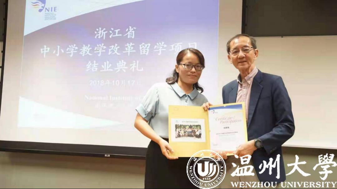 在2018年,工作的第18年,欧素鸯获得了去新加坡南洋理工大学“中小学名校长”公派研修三个月的机会。走出国门,踏入世界名牌大学,学习的不仅是先进的教育理念,更参观了很多当地的学校和行政部门,有了很多跨界学习的平台。这段难忘而独特的学习经历,让她学会了以国际视野看待当前教育,以发展的眼光投身教育,做一名有教育情怀的教师。她也深刻体悟到,教师要博识,不要有专业局限,要不断探索、求知,学习的内容要越多、越广、越好。借此,欧素鸯对温大的专业发展提出了建议:希望温大能“跨出去”,扩大师范生的学习视野,培育教师可以不仅限于教学技能的领域,还可以带学生到实地观察交流,站在社会的责任高度,投身教育的事业。
