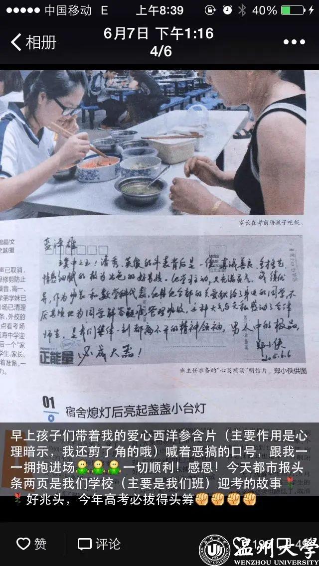平日里,郑小侠经常拿相机“偷拍”下学生们学习、运动和生活中的细节,毕业时他就把这些照片印成明信片,在反面写下祝福。2020年6月7日高考当天,《温州都市报》的头条登出了一张郑小侠为学生写的明信片。